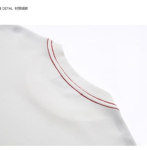 對比縫線:整件衣服(包括肩線、袖口及下擺)使用了明顯的紅色縫線作為裝飾細節。